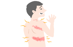 自覚症状としては『ピリピリ』といった神経痛の訴えがよくきかれます。治った後も痛みが持続される方もいらっしゃいます。背中~腰部にかけて帯状に発疹が出現する方もいれば顔面に発疹が出現する方もいます。顔の感覚神経である三叉神経、顔面神経、聴神経などの脳神経に沿って出ることがありその場合は目や耳、顔の動きなどに後遺症を残すことがあります。
