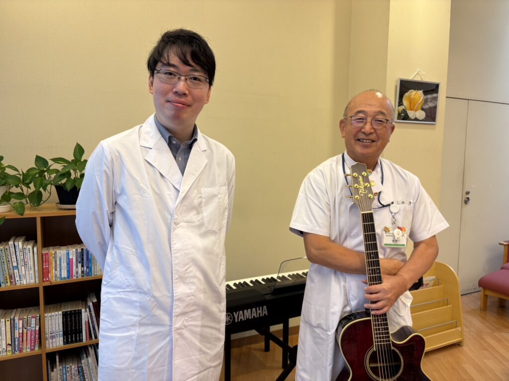 患者さんの聴いていらっしゃる姿に目を配りながら、患者さんのリクエストに答えていらっしゃる姿が印象的でした。藤里先生の穏やかで安心感を与える声のトーンでギターの弾き語りをされるお姿に、患者さんや職員さんが聴き入っていらっしゃる様子が非常に印象的でした。